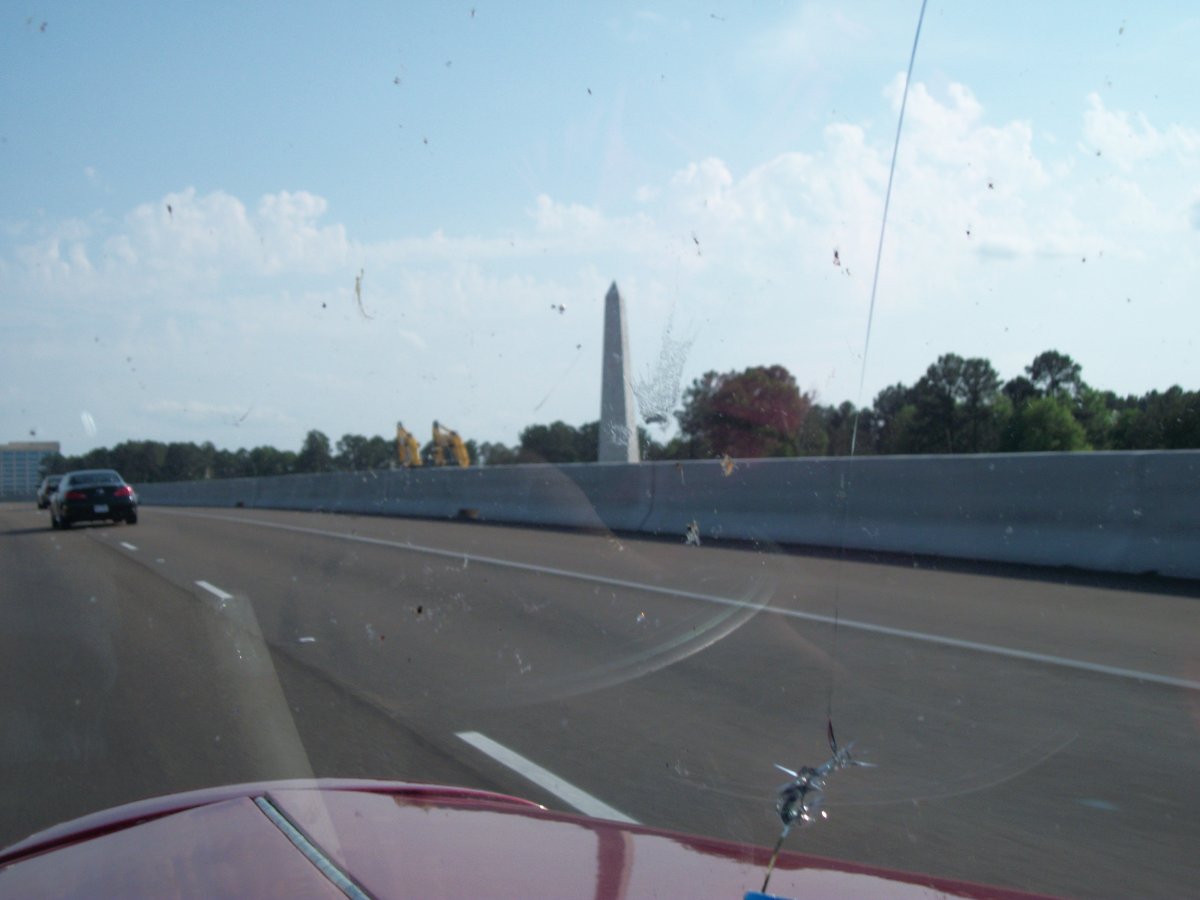 O.K........It's tomorrow--which would be today, Sunday.....I started at the Sooooopa Dome, but the thang is so big i couldn't get but a slice at a time with the '36 in front of it....I circled it a couple times (no...not from the interstate), but no TRS guys flagged me down....here's a hi-way shotthru the windshield Miss-sippi bugs & all.....