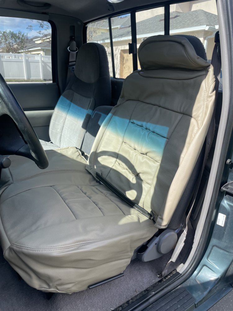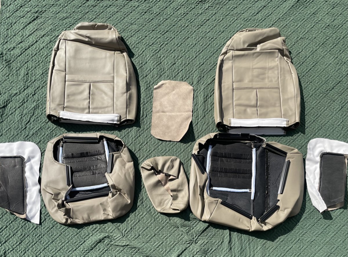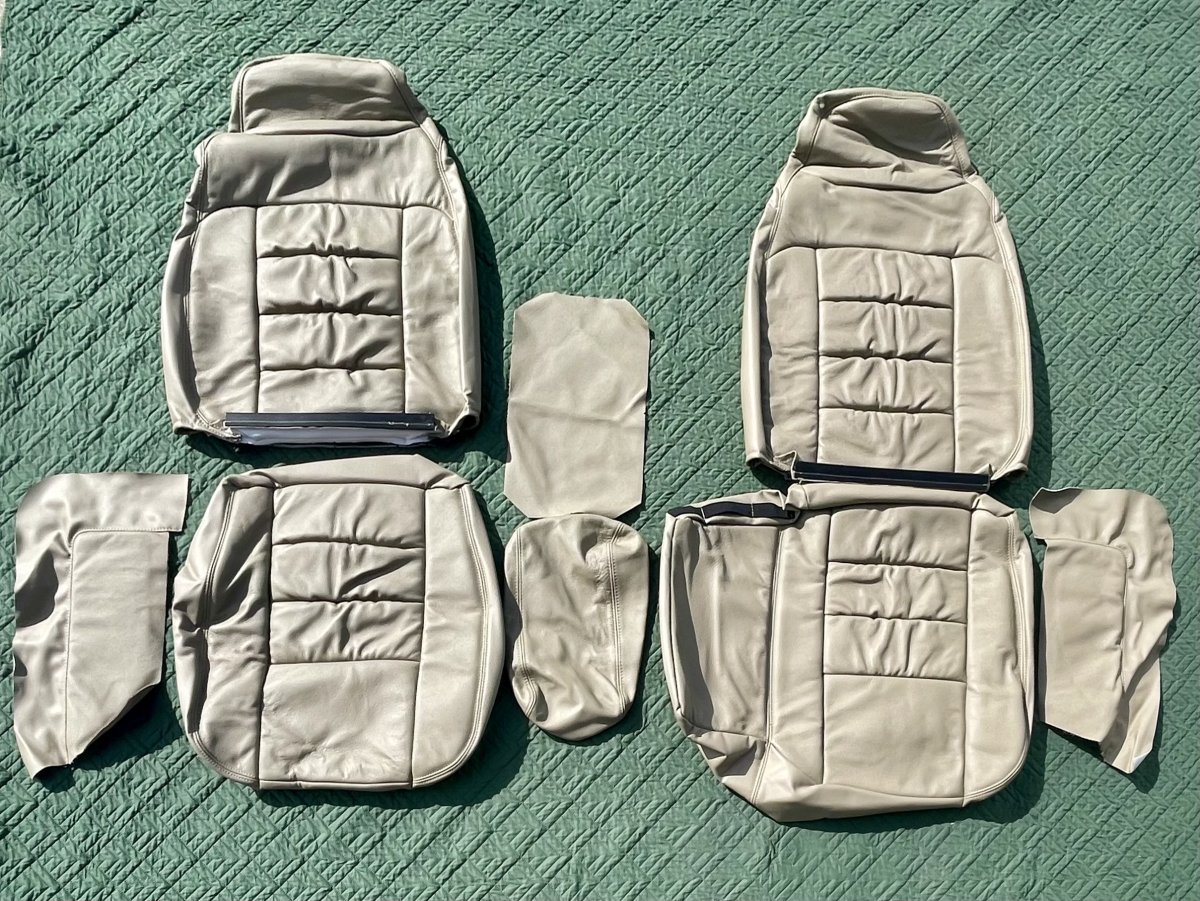 Tan leather upholstery (not covers) for 93 - 97 regular cab 60/40 seat. Possibly fits other model years, but you make that call for yourself. It’s real leather, made by Roadwire, a company that Katzkin just bought. The quality is equal to Katzkin sets I’ve used. The last photo shows the drivers side covers draped on my seats to show the details and shape but they look slouchy. These are tight fitting replacement covers, usually installed by a shop.