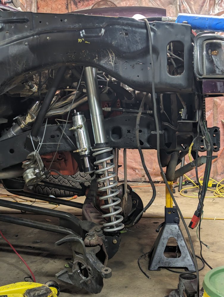 Well bit of an update now. Front end is mostly together now, just need to do steering next. I've got that all calculated out. With a 5" pitman arm I can put it to 8" long idle swingers and have 111° of steering angle with 3 turns of a steering wheel lock to lock. That one took some math to do. Coilovers are in and welded, truck sitting on its own weight with 16" coilovers on 300x16"/400x18" springs. Has about 1.5" of preload. I expect it to drop down a little more with bumpers and sheet metal which should be the perfect ride height.