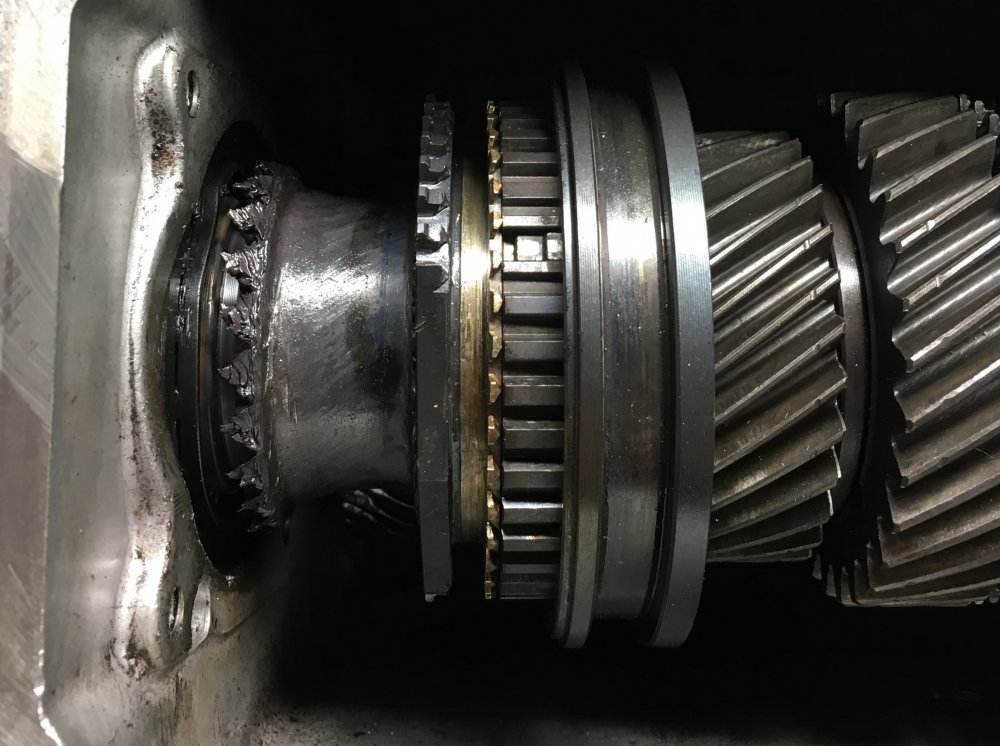 You need to have the output shaft nut off, the front bearing retainer plate in the bell housing off, then I usually grab the input shaft by the splines, punch it backwards to knock the output shaft bearings loose, then forward to knock the input shaft bearings loose. You also need to have the counter shaft bearings out so the shaft can sit down a bit. At this point the two sections of the main shaft should have come apart and you just gotta get the angle on the input shaft to pull it out the front.