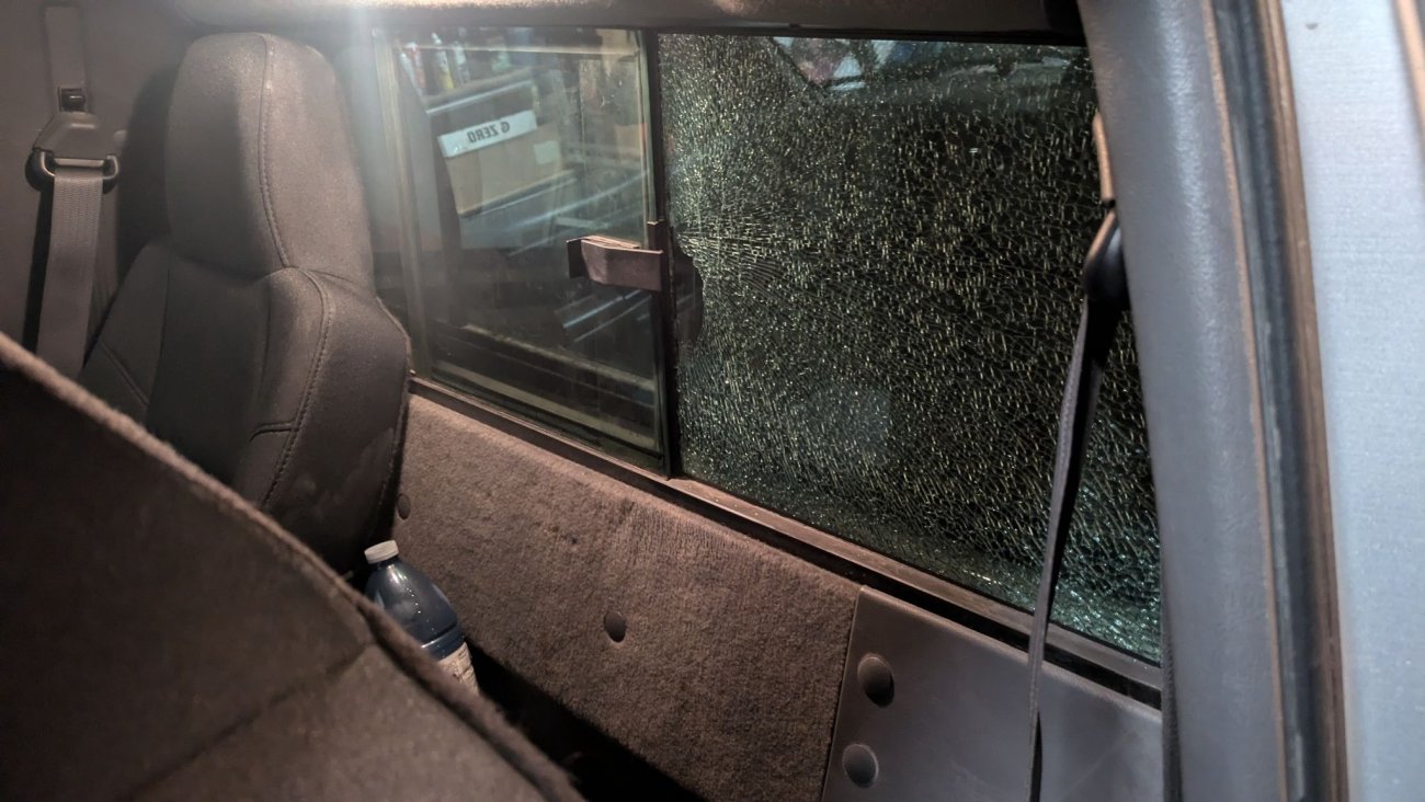 While driving at highway speeds, I reached back between the two of us to shut the rear sliding window. CRASH, the window directly behind my head shatters: