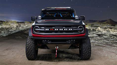 provide the base for the production model. Beefed up for Baja, Bronco R features an independent front suspension with 14 inches of travel and a production-based five-link rear chassis design with up to 18 inches of travel, plus custom Fox shocks, 17-inch beadlock-capable aluminum wheels and 37-inch BFGoodrich tires."