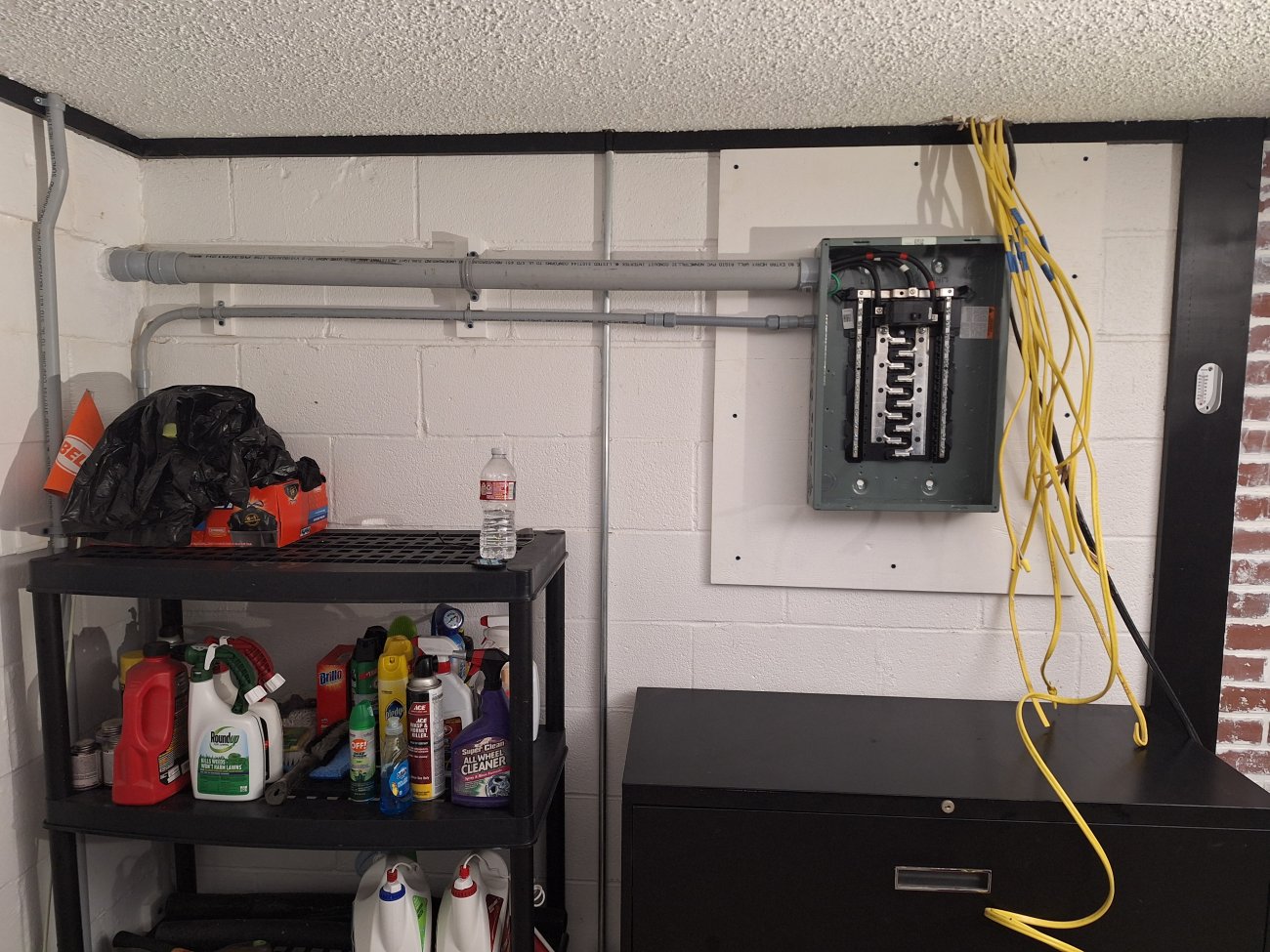 Do you have any short pieces of 2 inch left over? Technically, you should not have any exposed romex inside the building, especially a garage. You could run a short piece of 2 inch from the panel up through the ceiling and try to fish those wires through it. Or 2 pieces of conduit. Problem is, your panel probably only has one large knock out in the top middle.Seems crazy to fill this hole in with concrete when the concrete around it is so screwed up, but I just don't have the money to rip up the concrete around it this close to Christmas.