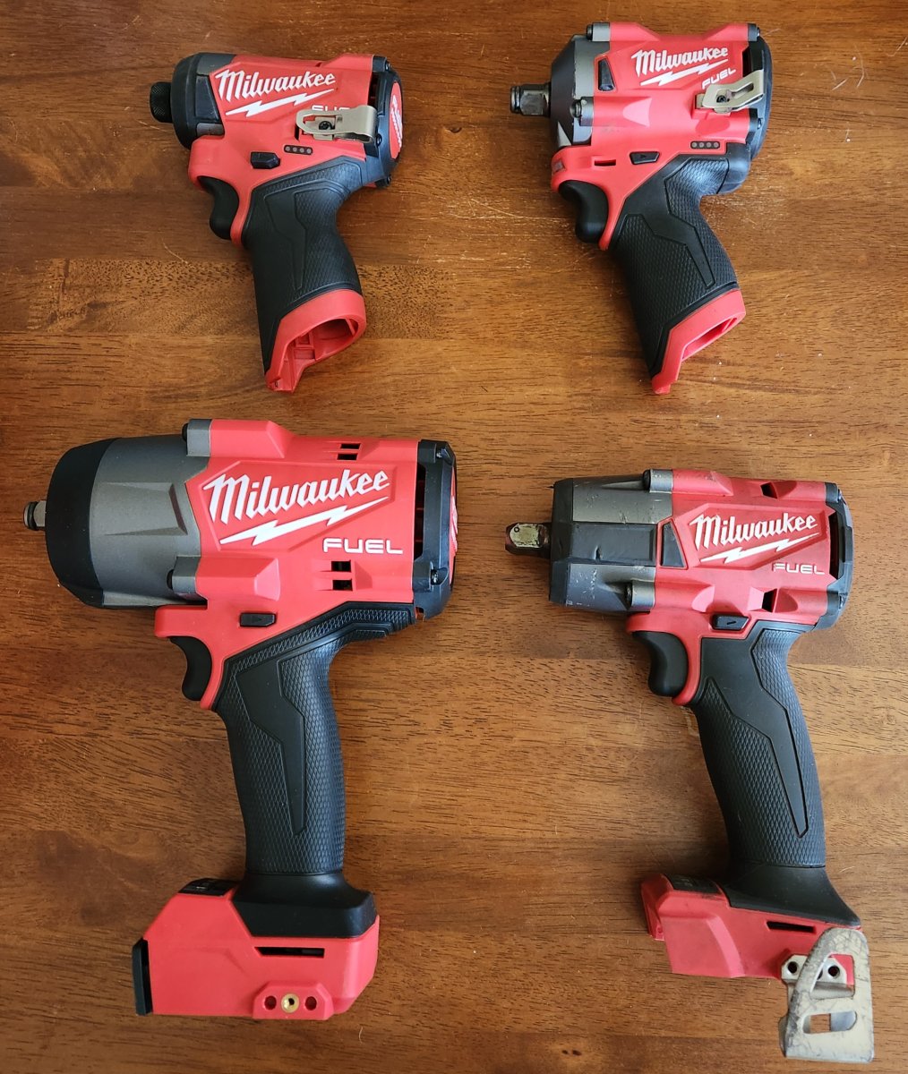 My entire mechanic career i survived with two air impacts. A bad ass 1/2 and a 3/8. Since I moved with no compressor in the garage I've embraced the battery Tools whole heartedly. I bought my first one just before I moved.... M18 mid torque 1/2 inch (lower right). I love it and hate it at the same time. Great torque and small enough for almost everything... but has a detent pin and makes changing sockets a complete pain in the ass.