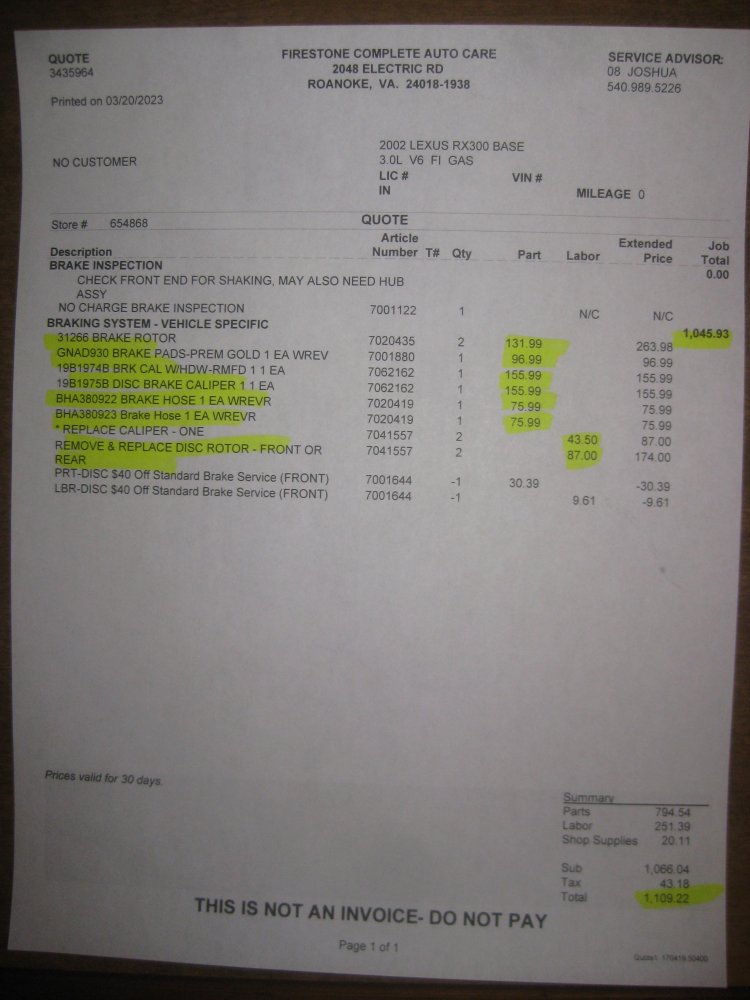 I dunno, how can a hose I get for $7 be $75? It doesn't make sense. I can get a set of rotors and pads for under $100, they want $350. It's a big difference. What irks me is they are making tons on parts.