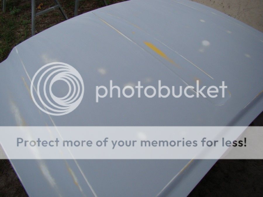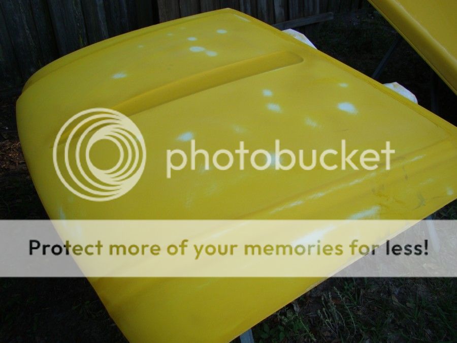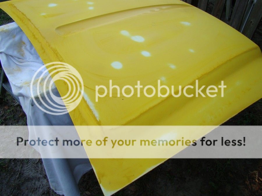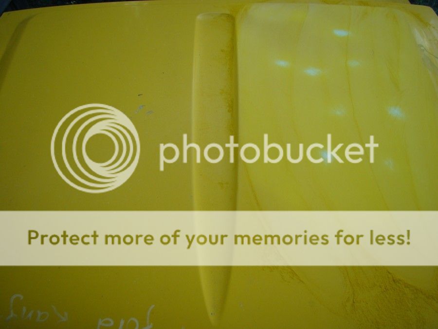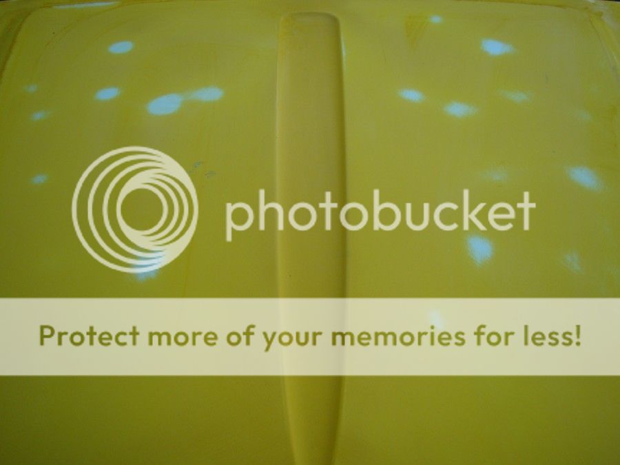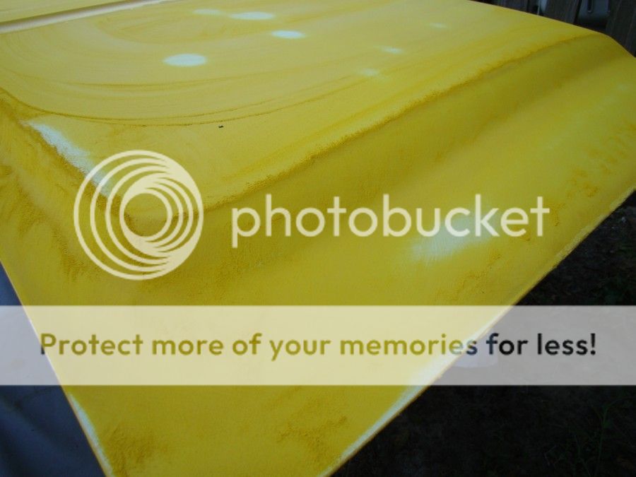 Because the used hood had been painted I decided to cut the majority of that material down with 80 grit paper. I started with a 17 inch file board on the long flat areas. The 80 grit will cut fast and still give us an idea of how straight the panel is by using the material as a guide coat. The yellow fleet color was quickly sprayed with very little attention to detail. A few areas are showing signs of poor adhesion which is why we are going to cut through it quickly; most of it needs to be removed.
