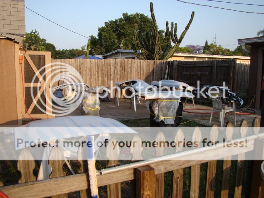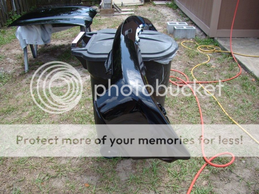 After letting the basecoat set up for 45 minutes I went ahead and shot three coats of clear over the top of the color. More trouble!!! 20 minutes after the last coat of clear went on the first rain drops started to fall. It was a mad scramble to get the Mustang out of the car port and then hustle the still wet panels under cover. The hood, the rear bumper, and the front bumper cover all have some pock marks from the rain. I am pretty sure they will all buff out fine but that remains to be seen in a few days. The rear quarter panels were not as bad and should be good to go after color sanding and buffing.