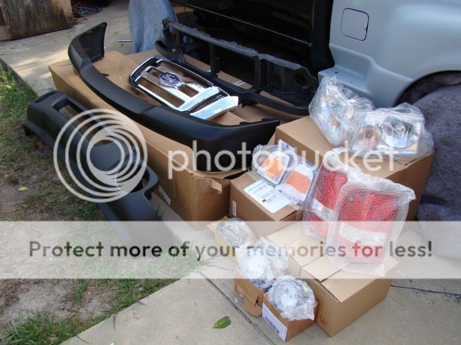 I carefully removed all the pieces and double checked my invoice as I went. One Header panel, one chrome grill, one front bumper, one front valance, two head lights, two tail lights, two park lights, two fog lights, one tailgate handle, and one Ford grill emblem. Check, check!
