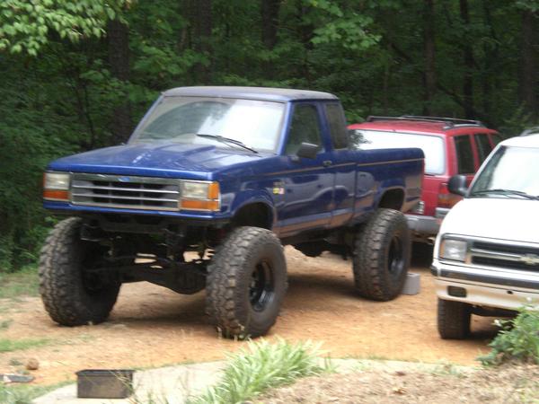 This is my 1990 Ford Ranger with 37x12.50x16 TSL SSR, on 16x10's Rock Crawler steel wheel, 5.5 superlift Lift, 2 body, explorer Leaf springs, 1'' coil spring spacers, Dana 35 front axle, 95 explorer rear axle w/ rear disk...also has a 2.9L bored .040 over, with Aftermarket cam, 5.0L fuel injectors, complete Accel Ignition, 58mm Throttle body, Honda Civic intake, PowderCoated Pacesetter Headers, custom 3" to muffler(Cherry Bomb, 2 Chamber) 2 1/4 dual outlets...