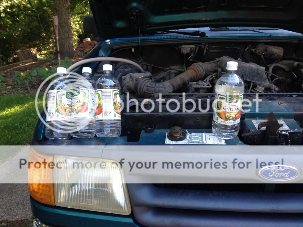 After the system was flushed with the garden hose, I pulled the radiator hoses and plugged the bottom hole so I could fill the radiator with white vinegar. It is a weak acid that helps eat away the iron deposits in the radiator. I am just trying to get it as clean as I can. I let is soak for a few hours and got even more sediment out.