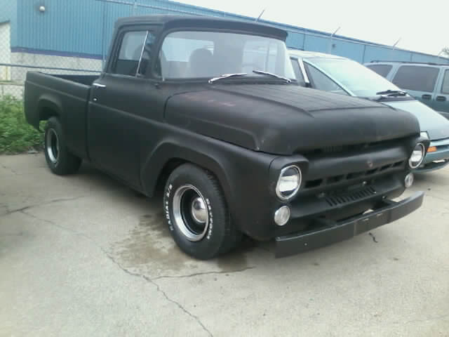 This is my '57 ford F-100 pickup. It was originally my fathers, he traded my mothers snowmobile for it in 1995. it was flat towed home behind an 88' BroncoII with the fenders, hood and other junk in the bed. Today it's got a 351W out of a '78 econoline van and a C6 trans, hoping to switch to a manual if i can find a good deal on one. The front suspension is wooped from years of driving with a few leafs taken out. i've been trying to figure out how to drop it another 2inches in the front while improving ride quality. i'll also be doing some lighting alterations and new seats. currently 2 buckets from a 94 explorer but looking for a split bench type of setup. the interior, or lack of it will be getting some TLC and hopefully a good shot of paint.
