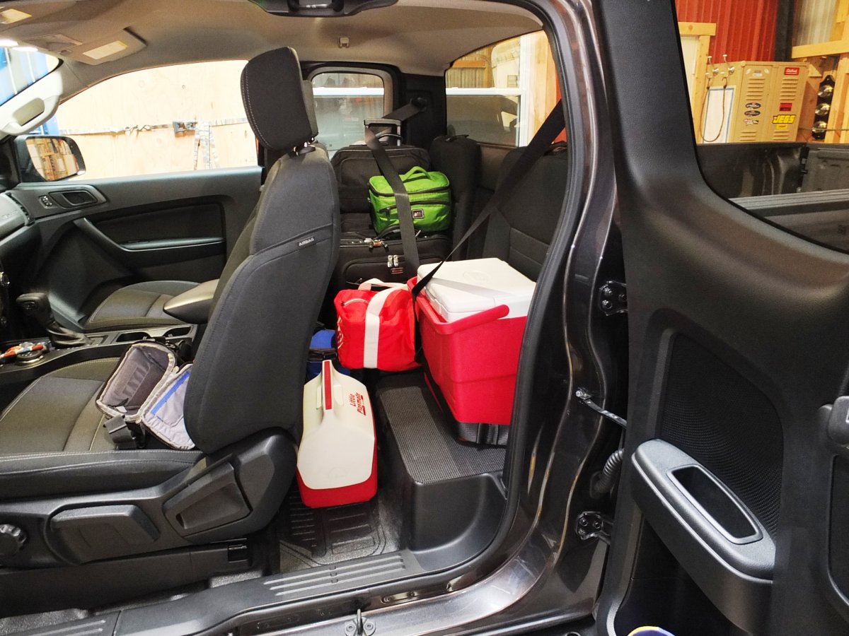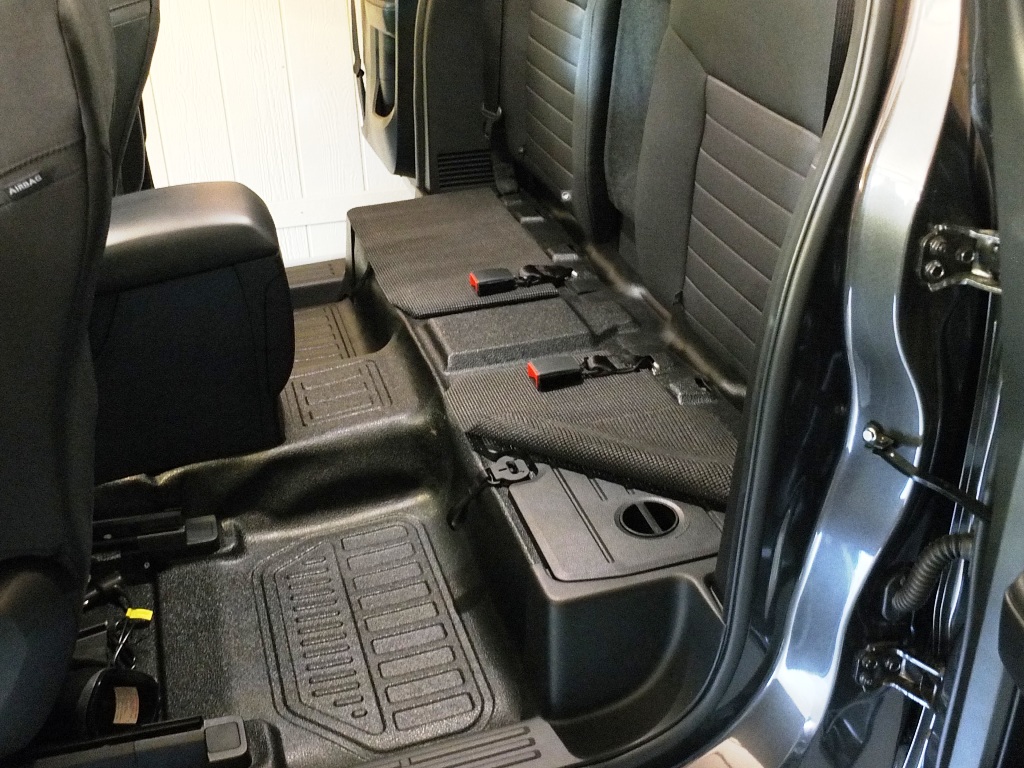 We just took out the seat bottoms and I covered the storage trays with some tool box drawer liners. The seat belts work great as "adjustable tie downs" and if you go to sell the truck, just put the seat bottoms back in and the dealer won't ding you for not having rear seating.