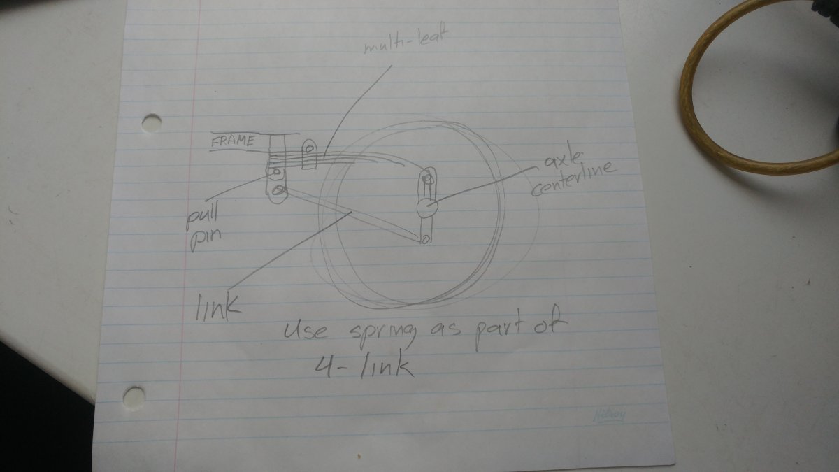 However, working off your drawing....If you pulled the pin for the spring at the front and swung the spring down and pinned it to the 4 link bar, you would have triangulation to keep the rear end in proper geometry, but the whole thing would swing up.....hmmmm...you're going to make me start cutting again aren't you!!! Lol!