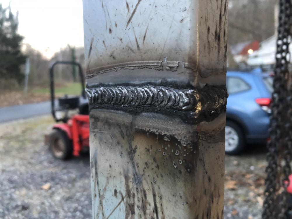 I had some H shaped pieces made of two 2x4 tubes with 3/8" caps and a 3/8" bar across. I cut the bars out with a plasma torch and welded the tubes together end to end, then welded the bars on the bottom to make legs. Then bolted the 1 1/2" tube on top. Burned it all together with some oil soaked 6011 that's been sitting in a very damp toolbox. The oil soaked into the rods caught on fire.
