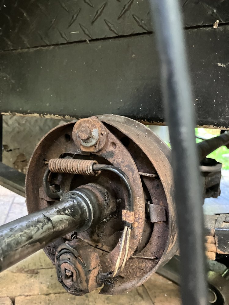 When I removed drums from the brake axle, the mechanism has surface rust, but was actually in pretty good shape. The friction layer of the brake shoes had popped loose on three of the four shoes, and I’m assuming it’s 3/4 worn down. The drums were very clean, no metal to metal, so I’m assuming the friction surface just popped off from moisture, while the axle was sitting for a few years.