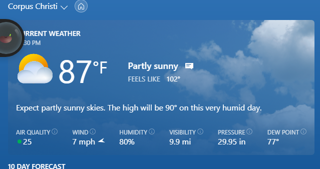 The low was 55°, the high was 106°. It is currently 90° at 9:00 PM. It was too hot to work in the Ranger today, and it is currently too hot to open the windows, and it is going to be warm all night, and start out warm with a low of 70°.