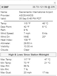 It was 66° Sunday morning, and got up to 106° Sunday afternoon. The forecast for today is a low of 74° and a high of 113°, with highs in the region ranging from 110° to 115°. Tuesday will be the hottest day in the forecast starting at 78°, which is very warm for a low temperature in Sacramento, then reaching 115°. Highs in the region are forecast to range from 112° to 118°. The high temperatures are forecast to be over 110° till Friday. That's five days over 110°. The previous record was two days. Also keep in mind that it's September and 115° will be a new all time high temperature record in addition to five days over 110° when the record high for September here is 109°, which wouldn't seem so extreme if this were to occur in June, July, or early August when there is a lot more insolation. Don't confuse that with insulation. The weather models are forecasting a rapid cooldown and some rain for next weekend. San Diego may also see some rain from the remnants of Tropical Storm Kay the following week as several troughs beat back the Pacific high and bringing some rain to Northern California which will progress eastward bringing some fall weather to the Great Basin. That's what the weather models are suggesting at this time.