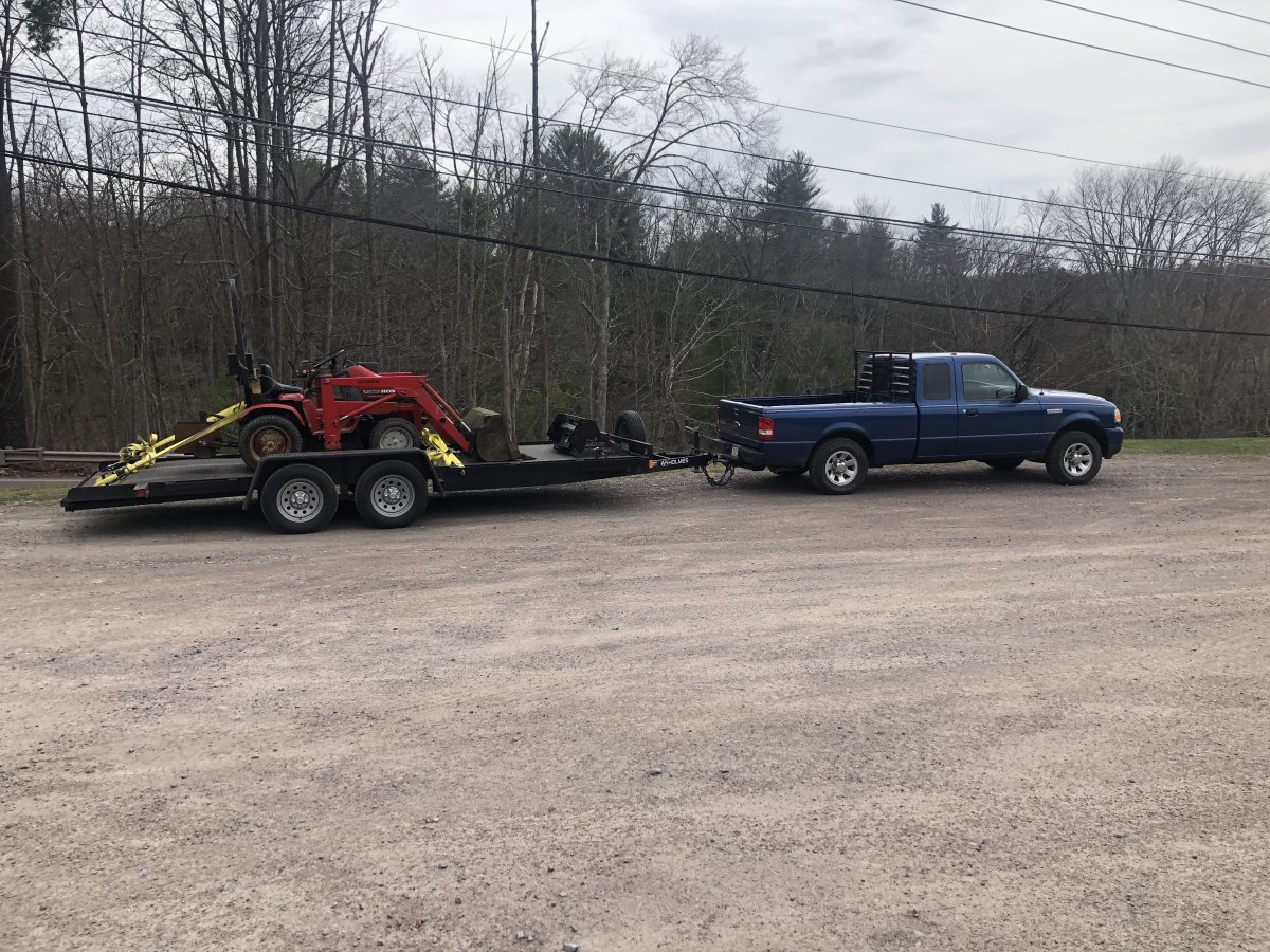 That’s a 2200lb 18’ car trailer, electric brakes, with at least 2500lbs of tractor. I’ve towed cars with this setup too.