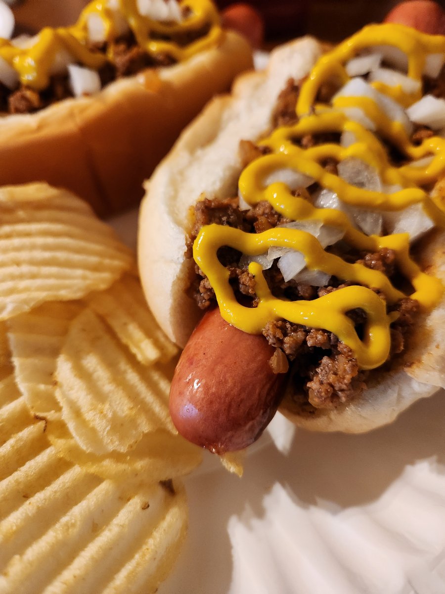 pile of wavy potato chips, hot dog with ketchup & mustard, sizeable(big) bowl of Cinnamon Bun vanilla ice cream.