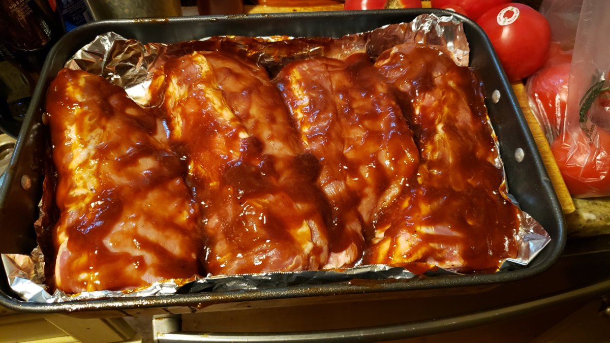 Pam pan to receive ribs. Smother ribs with sauce. Cover with foil.