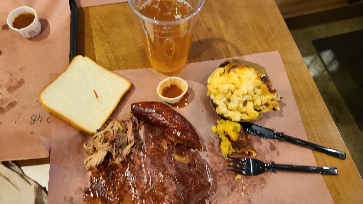 Went to a fairly new barbecue restaurant tonight. Supposed to be Texas style. But I've never been to Texas. So I don't know. It was real good. I sampled the brisket. I ordered pulled pork and a link of sausage they call Texas Hot Gut. It was all delicious. Mac n cheese was creamy and awesome. Green chili corn pudding was good. I'll be going back occasionally.