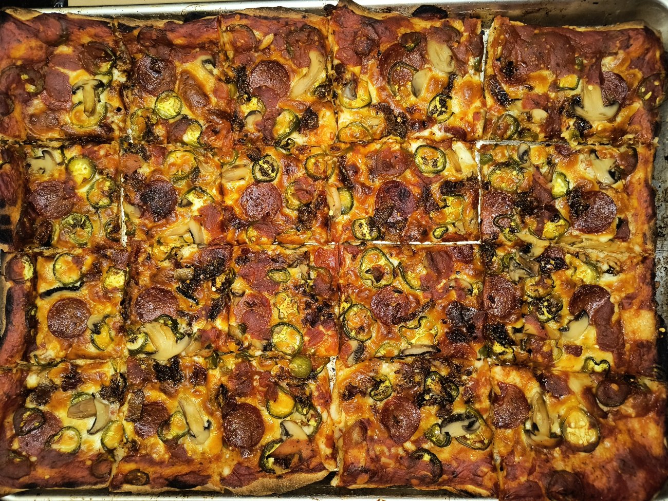This was a tasty effort. New brand of pepperoni, double jalapeno, mushrooms and oven baked savory bacon extra sauce and extra cheese..
