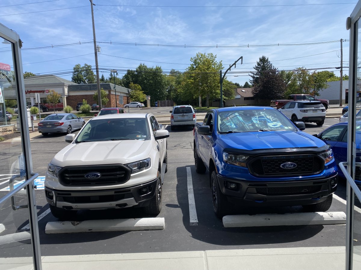 Pic out my office door today with a stock white truck next to my blue one with a 1.5” Truxxx level and 265/70’s.