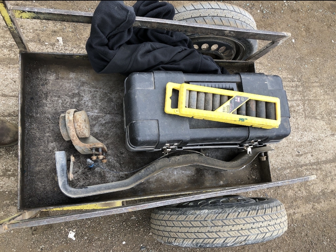 Finished up my frame/ suspension rust repair, scraped & cleaned the frame then hosed on some rust-o-ilium heavy duty red primer and some cheap undercoating (all I could find around here) New muffler and tail pipe, then got the bed back on along with the tailgate, bed liner and tool box. Hauled my trash away, much better in the turns and quieter as well, now for some Slaw-Dogs 'cause I skipped lunch.
