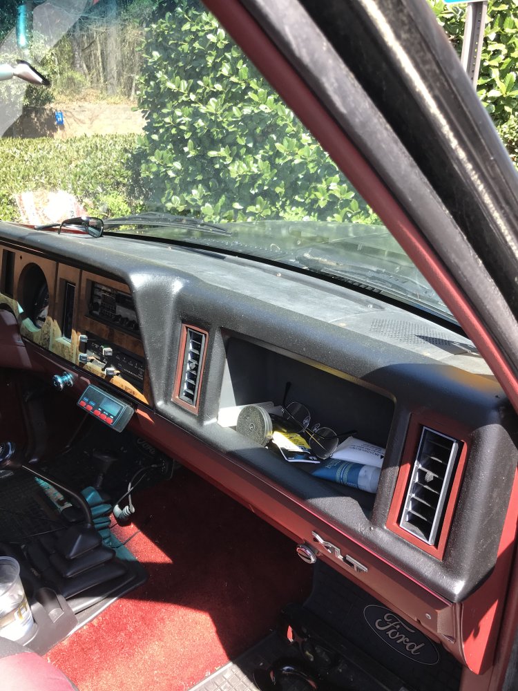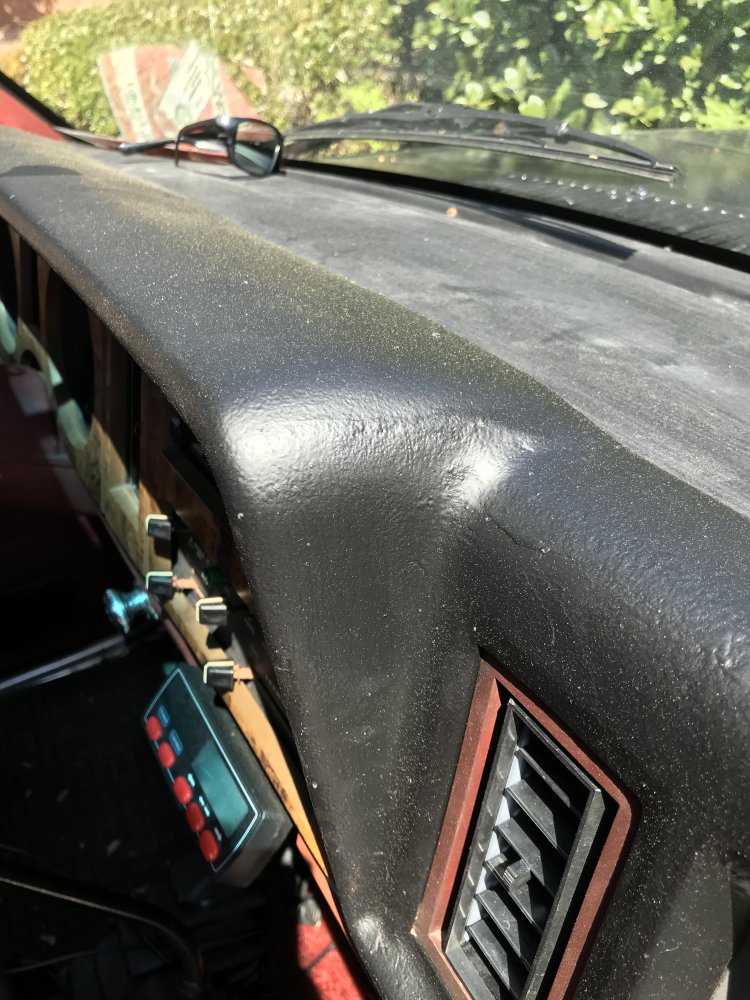 Ok, I don’t want to WOW you guys and make you faint with full pics yet, and this stream is what did you do today, so let me share this. On the 87, my dash pad was shredded, absolutely impossible to salvage. I was in the scrapyard and I found an 88 that only had a couple cracks in it. A little bird told me if you grind out the cracks, and you carefully fill them in with hot melt glue, you can then sand the glue and make it straight. Being patient, which is not my long suit, it came out great. I realize that if I sprayed it, you could still see the repair places, so then I decided to roll it with a nappy roller with semi gloss rust oleum. That added a texture, and it looks fantastic, and it cost $3-4.