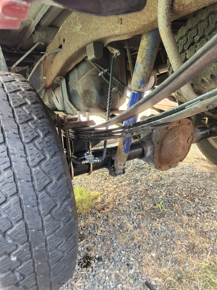 Well it's all done. All the bolts are tight, the brakes are bled , with the axle at full drop the brake line just starts to pull tight, after some gentle massaging of the bracket, I ended up reusing some old u joints, on the drive line but the smaller one is a greasable spicer that has less than 5000 miles on it. And the large one was ok? I'm fully expecting some noticeable vibration from my questionable driveline manufacturing skills. I intend to find a single piece driveline at some point but I just needed to get here first. I also went ahead and fixed the wire running issue that was preventing me from plugging the coolant temp sensor and oil pressure sensors in the line to the oil level sensor is still broke but i looked its full :unsure: :rolleyes::ROFLMAO:View attachment 97415View attachment 97416View attachment 97417View attachment 97418View attachment 97419View attachment 97415