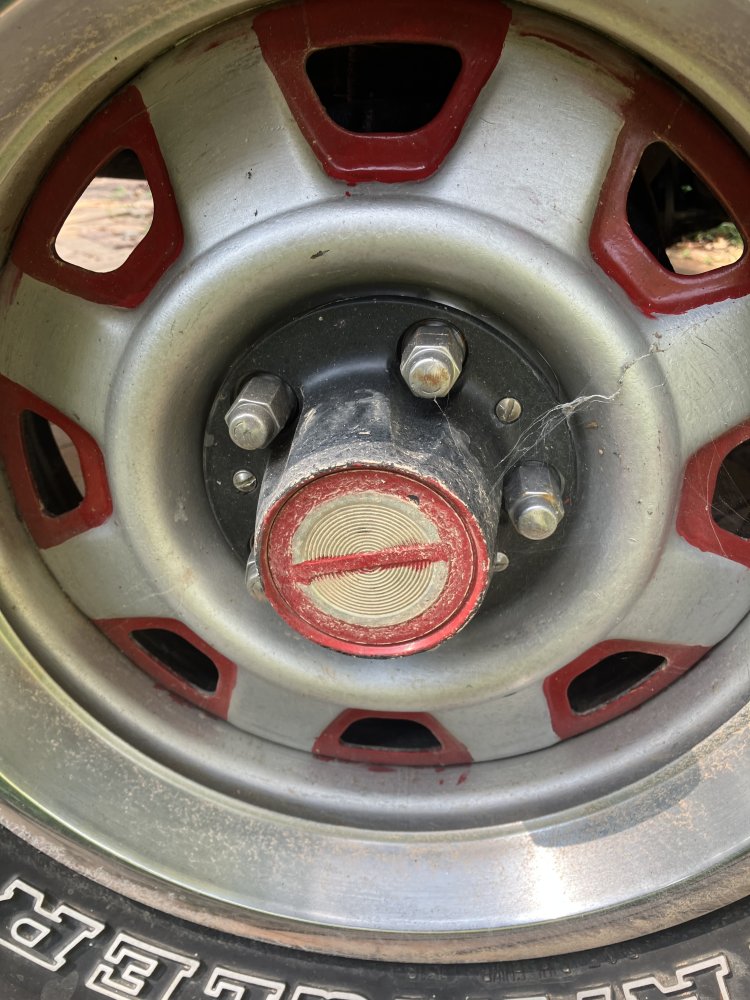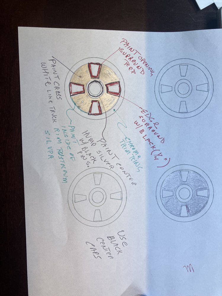 On the cross wheels, I would paint the outside ring Silver/Aluminum, from the edge of the tire all the way inside. I would paint the Cross white to start. I would paint the little surrounds around the trapezoid holes red. Then I would outline the red trapezoids with a thin, black painted stripe, semi gloss black. I’d paint the raised center hub around the center cap silver. I might put a black center pinstripe on that hump as well, but first I’d see how it looks. Chrome trim rings. And I would use the black center caps, and highlight the 4 Wheel Dr., actuator, red, and the outer edge red, and then I would mimic that on the back axle hubs. Something like this: