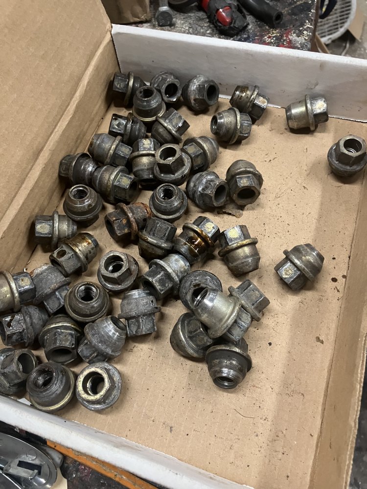 Not to be totally defeated, I was out of the lug nuts with the little flange that holds those center caps on. I was actually short a couple, and a couple of mine were pretty rusty and messed up. I had a little impact with me, so I rounded up 40 of them. Then the pull a part didn’t have the heart to charge me for them. Saving grace here is they rent golf carts. Best five bucks I’ve ever spent.