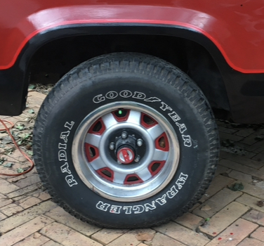 Usually they’re a flat or silver/gray, and the highlights on the holes are black. New, they are flat or silver/gray, and the highlights on the holes are black. The trucks that had them usually had trim rings. I just need one clean straight wheel, I’m going to clean it and sand it and paint it anyway. And BTW, I’m looking for $25 like you find them in the Pull a Part. I know where I can buy one now, but not at that price