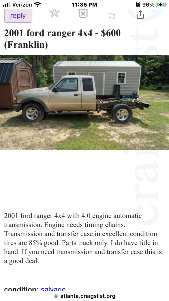 So, really I just need a 98+ extended cab 4x4 rolling chassis. Dad wants his V-8 Ranger put back together. The first frame donor we got, a tree fell on it in a storm after we got it. The second frame donor we got I had to move to a family friends place and it jumped the blocks we put down and rolled into a tree. I haven’t told dad about that yet, I’d like to find a way to come up with a good frame. Everything else I should have or be able to come up with, but a front clip would be a bonus.i’m not making any promises, but what year and what size engine? And give me anything else I would need to know to find the right one. I’m in craigslist and Facebook & all 10 times a day. But you know the drill, when something pops up, you have to move quick!