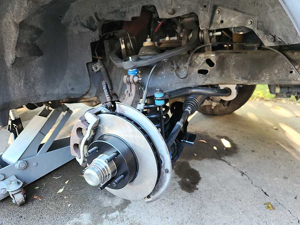 I installed new pads and rotors. That completes the front suspension project. New upper and lower control arms, inner and outer tie rods. Both lower ball joints and one outer tie rod end was toast after 17 years and 206,000 miles. I think they may have lasted longer if the dust boots didn't disintegrate. Now it's nice and shiny!