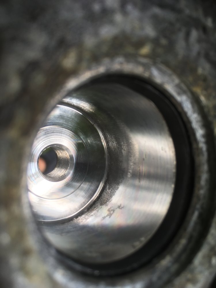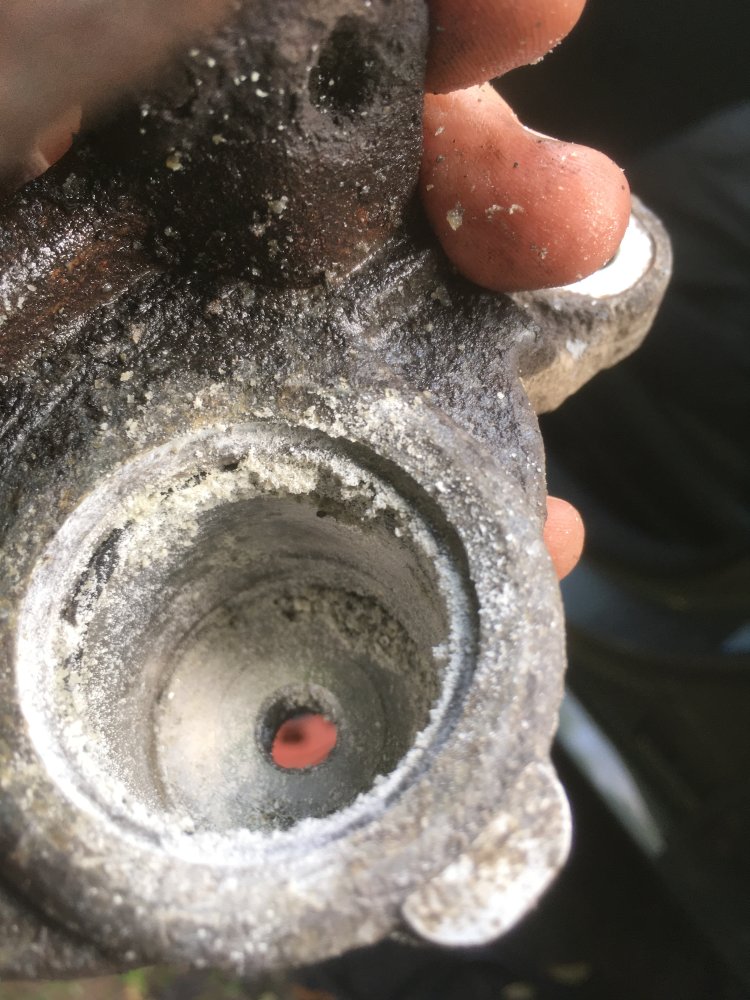 That's when I realized - and this is what I hate about this car, it's stupidly over-engineered, but on the cheap - the pot for the piston is aluminum but the hook that grabs the pads is steel. Brilliant. The piston bore is a sacrificial anode.