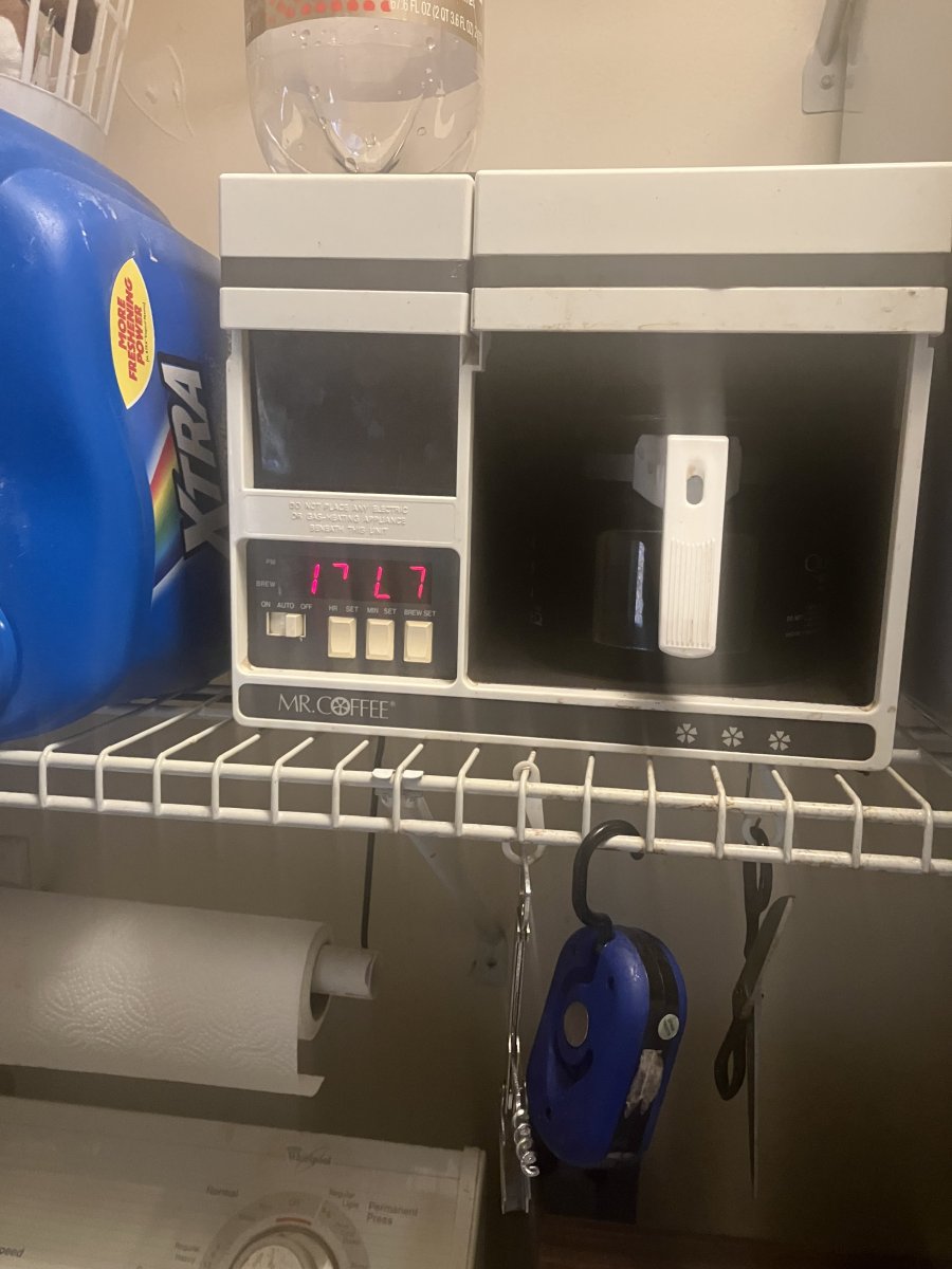 The other day I had a mental fart, and I made my morning coffee in my ancient Mr. coffee UTC/shelf model, but I forgot to put the glass pot in. This is on a wire shelf in my laundry closet upstairs (aka my upstairs kitchen). The coffee went everywhere, but mostly down the washing machine into the drain pan under the washer, instant my downstairs ceiling. When I cleaned up the mess, the digital screen clock on the coffee maker was black. When I pulled it off the shelf, it still had the $5.95 crayon price from when I bought it at Goodwill years ago.
