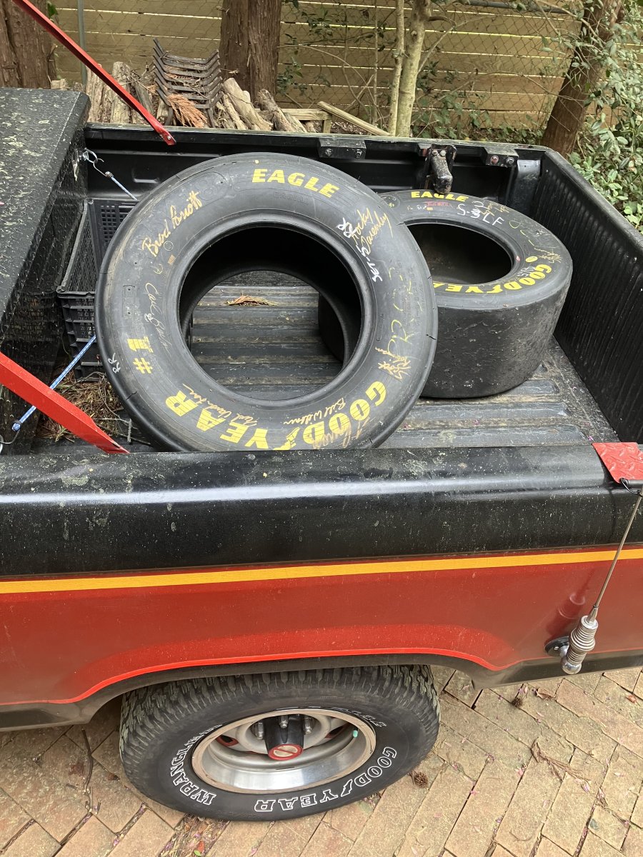 An interesting acquisition yesterday, Craigslist, didn’t cost me a nickel. I picked up two NASCAR race day tires that were autographed by the entire pit crew for Rusty Wallace (?).