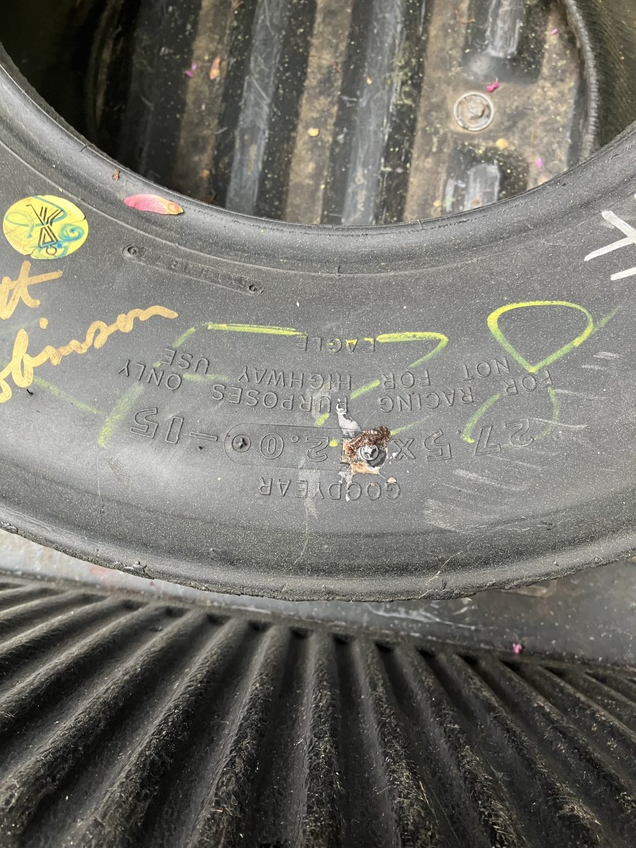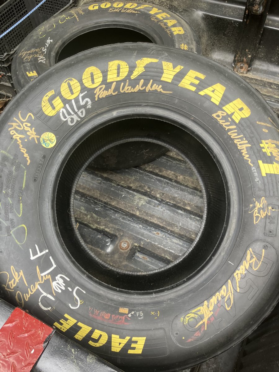 There’s a light yellow crayon mark on both. One is RR52, and the other one is LF29. Apparently these codes were written on the tires on race day as they were distributed to the drivers from Goodyear at each race. RR and LF are right rear and left front respectively, and the number is supposed to be the number of the car.