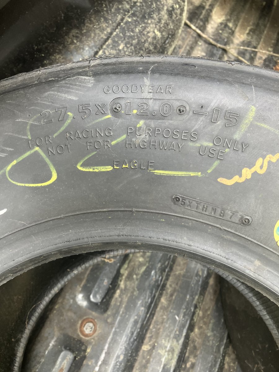 On the tire, where it says “Goodyear” and “eagle,” there are thin lines that run through the words. Apparently these thin lines define “bands” where the number of bands indicates which racetrack ran the tires. I found that info, but I can’t find any info on which band is which track.