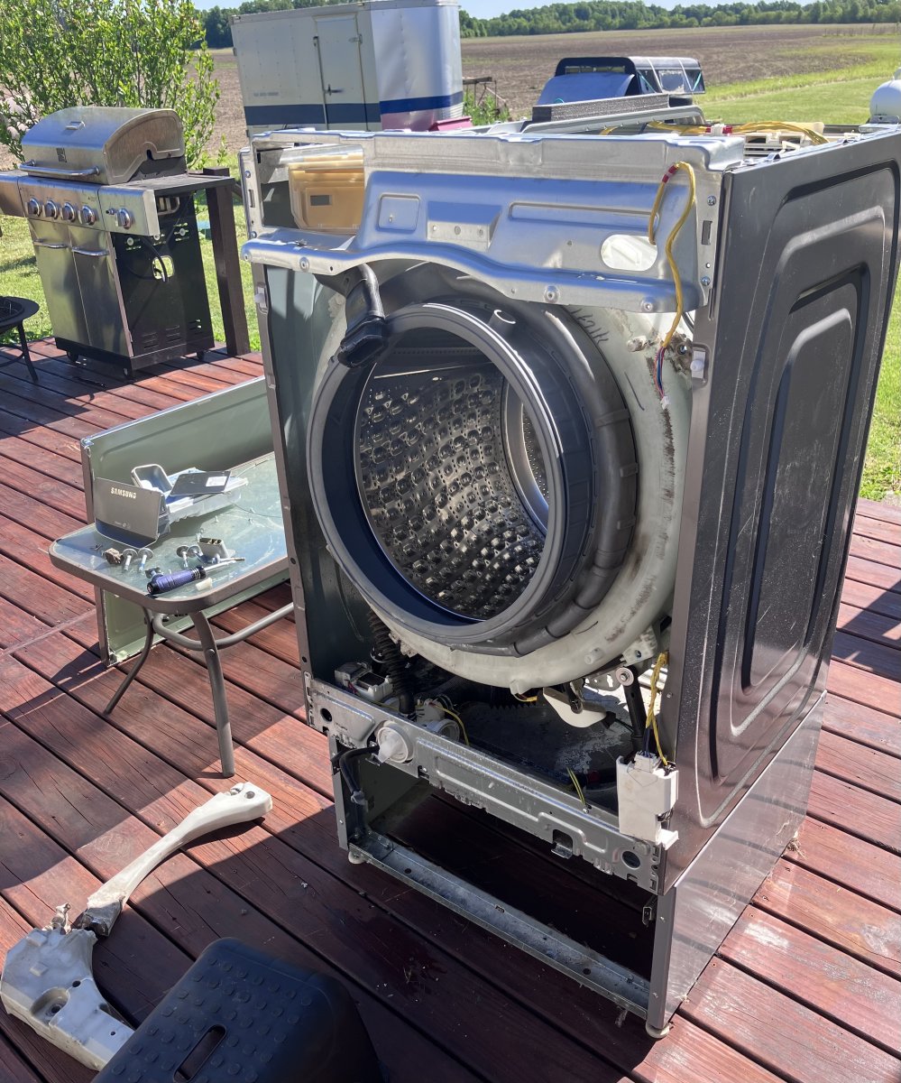 Took apart my 3-year old front load samsung washer, it had started vibrating violently & was leaking. Turns out they use counter weights inside on the outside of the drum, plastic filled with concrete. Well a few bolts loosened, one broke and this alignment pin thats part of the outer drum broke off. (hence the water leak) Its just 9 months outside of the warranty. “technically “ it could be fixed. For about as much as another. I wondered why it was so rediculously heavy. Damn junk. spent half the day researching. Still dont know what to get, not another samsung though.