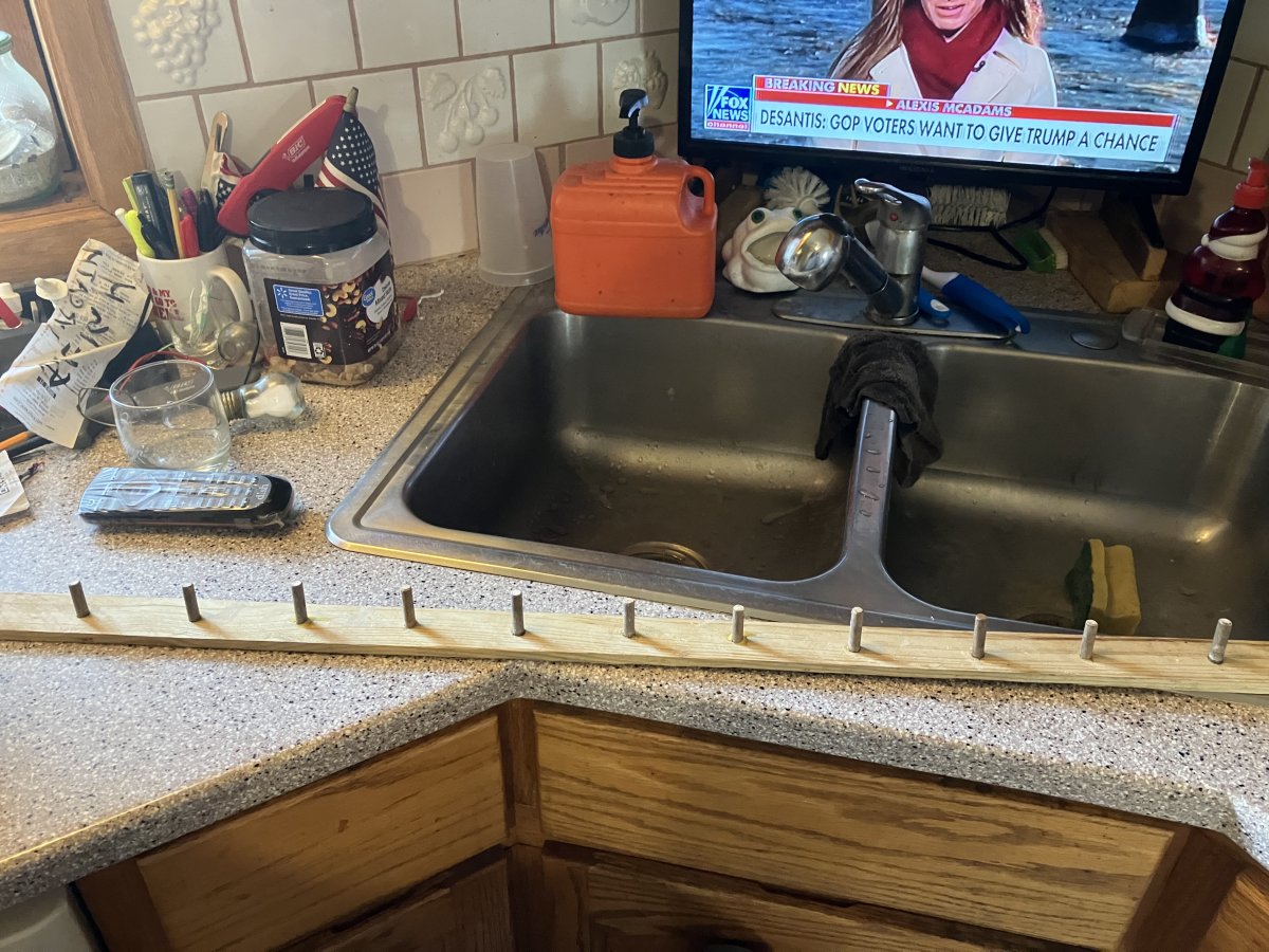 I ripped a 3/8 inch piece of 2 x 4, 36 inches long, drilled it at an angle and put in a dozen pegs. It’s for Sweet Pea to hang up her mops and brooms in her laundry room.