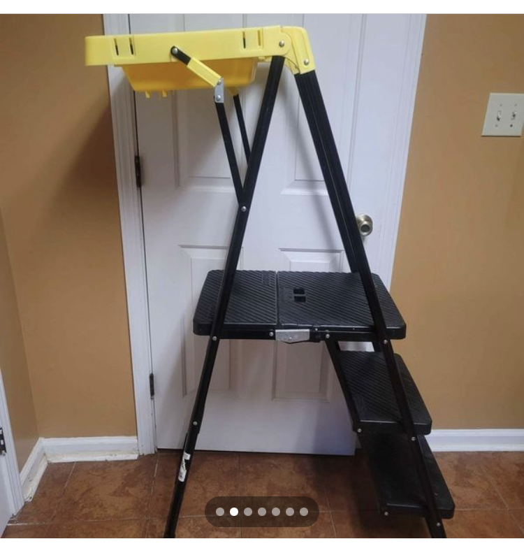 I looked on Craigslist/marketplace, and I picked up this 3-step Cosco ladder. It’s very solid on the ground, wide base, It has a nice stable platform on top, and a fold out shelf.