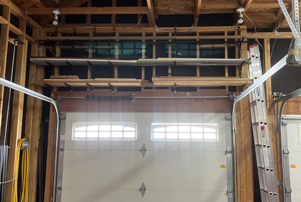 Made a set of steel racks for over the third garage door. This is to get the assorted pile off of the garage floor. Now steel on the top rack, pipe and conduit on the second rack, and lumber on the lower. It may not be so easy to pull down what I need but the floor pile was no better and always in the way.