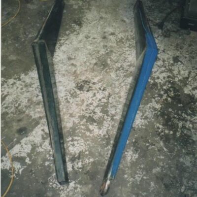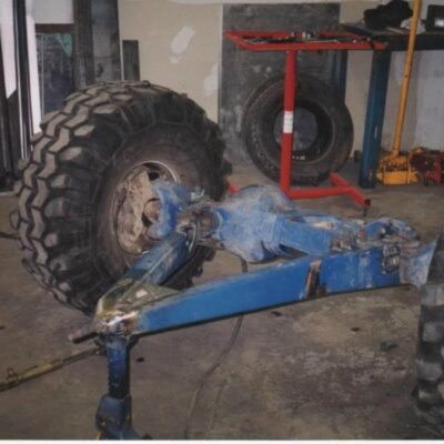 The Twin Traction Beam was starting to limit flex, so Gwaii welded the Dana 50 TTB together to form a solid front axle. A new issue was the radius arms. With one going up and the other going down, it twisted the front end so much, he had the alignment going out all of the time. His solution was to pull the radius arms together and weld a pivot on the junction.