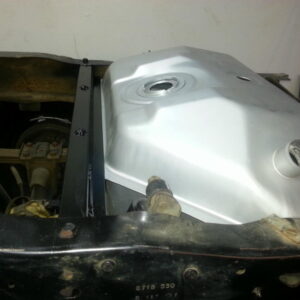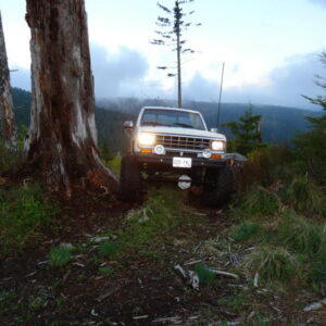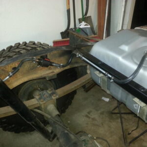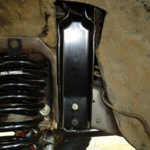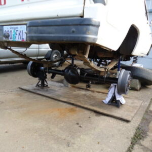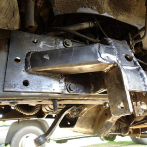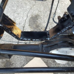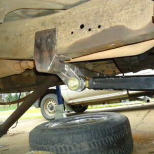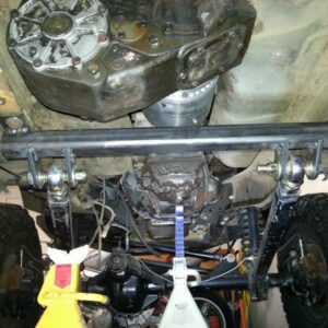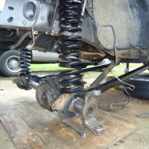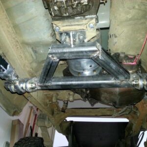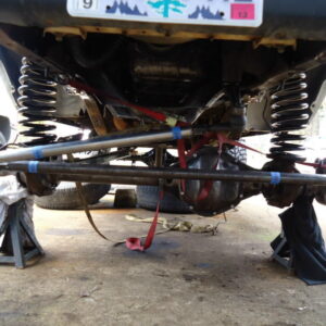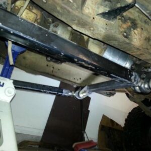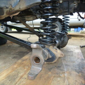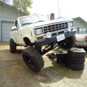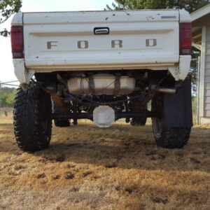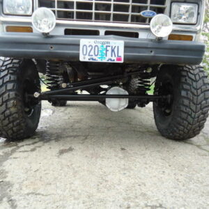 It was about time to lift the front and decided to go against TTB and go with a solid axle. I swapped in a full width Dana 44 out of a ’77 F-150. I used the coil setup but with 4.5″ lift EB coils. I extended the stock Radius arms approximately 12″ and used 1.25″ Heim joints at the ends for better flex. I built a cross-member to mount the radius arms to. I geared the front axle with 5.13’s and a Spartan Locker. I used Chevy 1-ton steering set and tie rod ends on the steering and swapped the steering about the knuckle instead of below. I built the track bar and track bar mounts on the axle and frame itself and used heim joints.