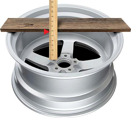 To measure backspacing, lay the wheel facedown. (Pro Tip: use a soft surface to protect the wheel face.) Place a solid, flat item, such as a board, across the wheel so that there’s a flat surface touching both sides of the wheel. Then, using a ruler or tape measure, measure the distance from the mounting surface to the base of the object.