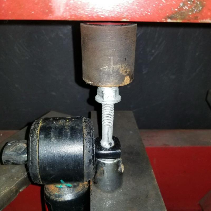 18. Place the bar pin of the lower strut mount into a vise and hand start the nuts. Next use a hammer and knock the studs out of the bar pin. Retain factory hardware for reuse.