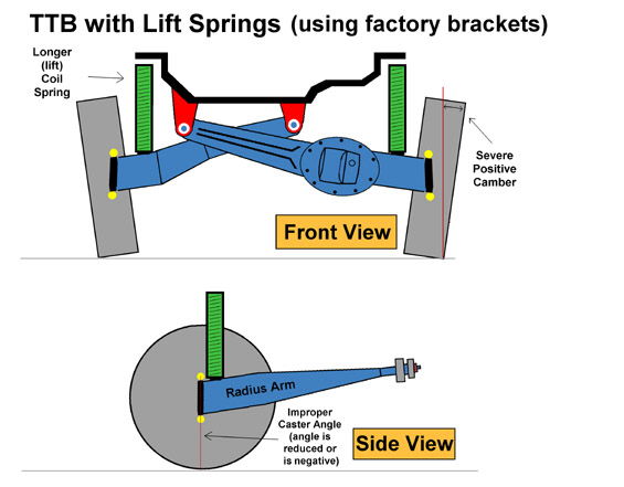Using the (2) diagrams below, you can see how lifting a Dana 35 TTB greatly affects your caster and camber. It is the camber that will be most visually evident.