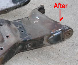 Here the beam is cut, and the bottom of the knuckle is pushed outward to correct the camber. You can see where a piece was welded on to hold it in its new position.